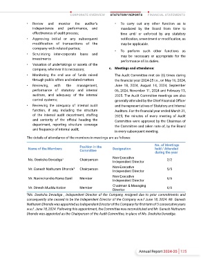 The Committee’s composition meets the • Examination of the financial statement and Dhonde was appointed as the Chairperson of the Audit Committee, in place of Ms. Deeksha Devadiga.