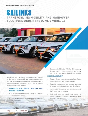 service partner in car rentals and manpower solutions, » Modern, diverse fleet comprising sedans, MUVs, » Professional, well-trained male and female Through its association with Sailinks, DJML is poised